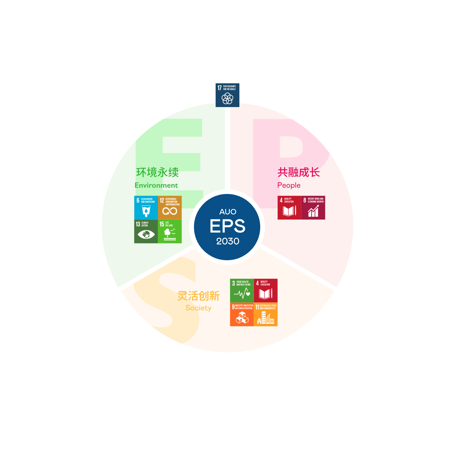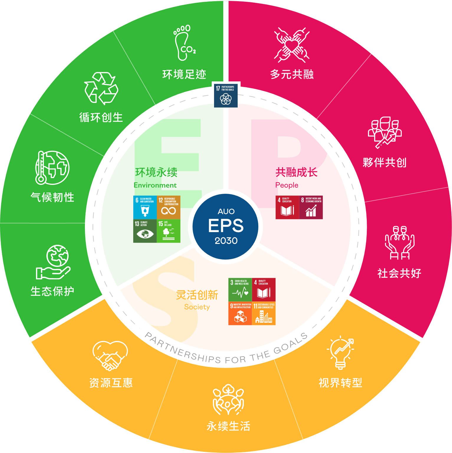 接轨联合国 SDGs 永续发展目标,非凡娱乐光电以“超越企业社会责任,创造共享价值”为愿景,制定 EPS 三大永续发展主轴,并延伸订定具体目标引领行动,擘画企业永续策略路径。以 2018 至 2025 年的 EPS 实绩为基础,非凡娱乐以 EPS 2030 展望未来,设立 30 项永续目标,持续推动企业永续实践。我们将持续致力于降低环境冲击与发展循环经济,深化社会正向影响力,并通过创新研发强化场域应用技术,开创人类生活全新可能。同时携手生态圈伙伴,共同迈向企业发展与地球永续的双赢局面。