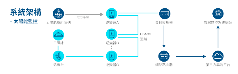 具有高穩定性高相容性及簡易安裝等特色,支援市面上所有型號的逆變器、電錶、類比數位轉換器及氣象感測器。