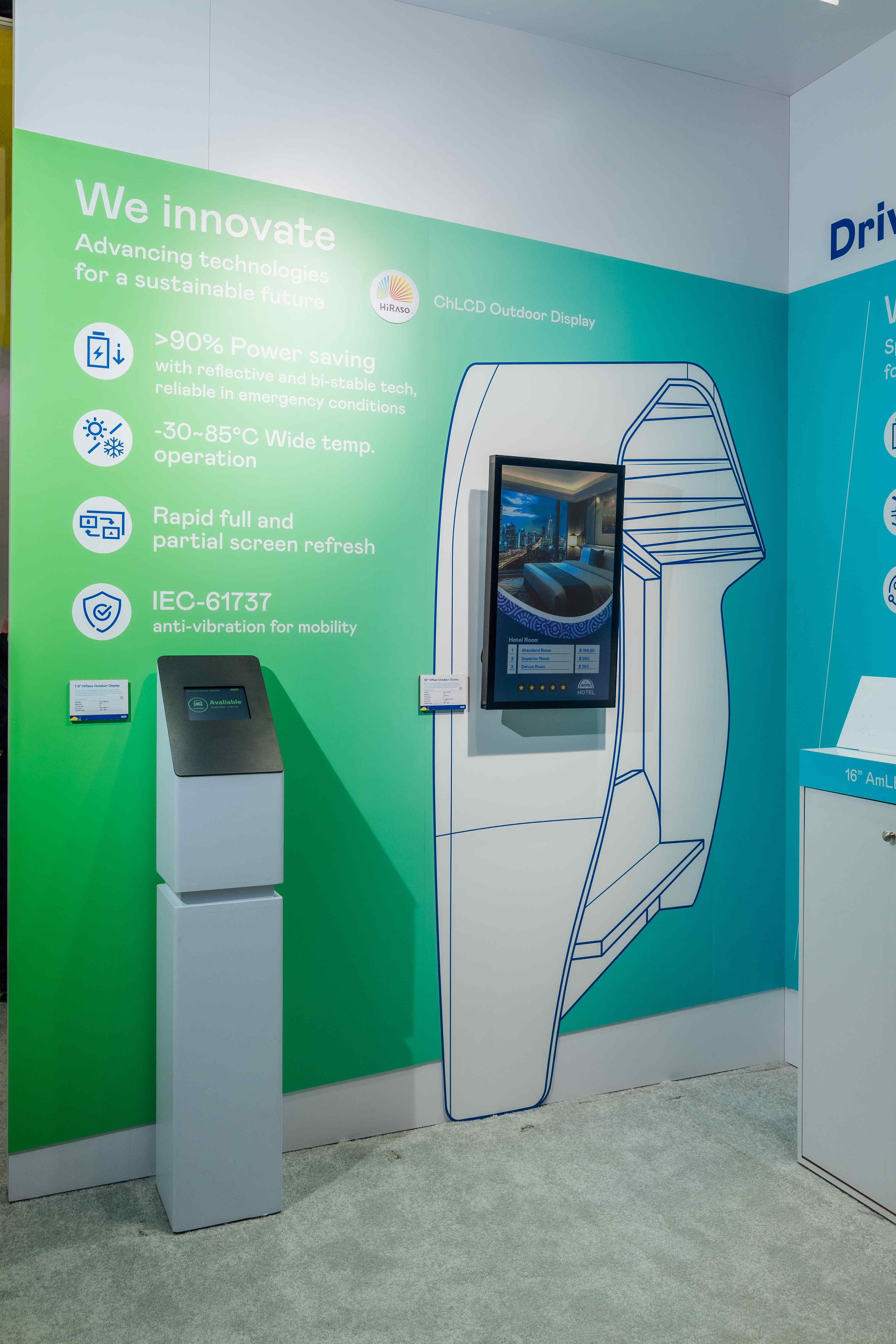 HiRaso CHLCD Display achieves zero power consumption when displaying images by utilizing reflecting ambient light to be more eco-friendly. The stronger the light, the better the color saturation and display effect can be presented. Meanwhile, it can work in extreme climate from -30 Celsius degrees to 85 Celsius degrees. With the advantage of wide operating temperature, it is the first choice for outdoor electronic signage.