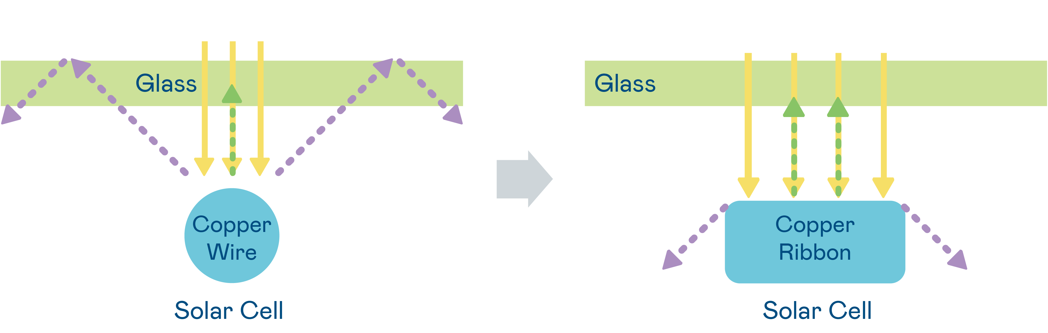 The solar cell utilizes multiple strands of copper wire to form shorter current paths and improve current collection efficiency; the round copper wires increase the amount of light incident to the battery compared to traditional flat copper ribbons.